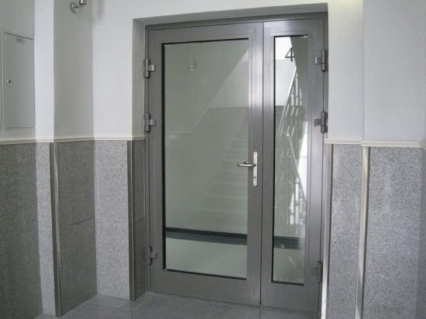 От качества заполнителя зависит, насколько эффективно преграда будет препятствовать распространению высоких температур. Материал должен быть негорючим и стойким к температурным воздействиям. В комплектацию противопожарной алюминиевой двери также входят уплотнители, ручки, замки и иные элементы фурнитуры. Дополнительные фурнитурные детали: доводчики, отбойные пластины, пороги разных типов.