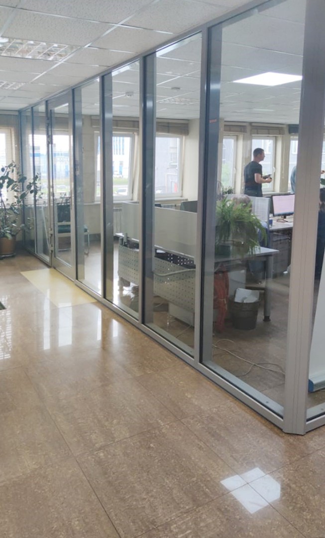 Противопожарные перегородки EIW-60 могут изготавливаться как в полностью остекленном варианте, так и в частично остекленном исполнении. Основное предназначение таких конструкций — это разделение общего помещения на несколько отдельных рабочих зон. При этом преследуется несколько целей: